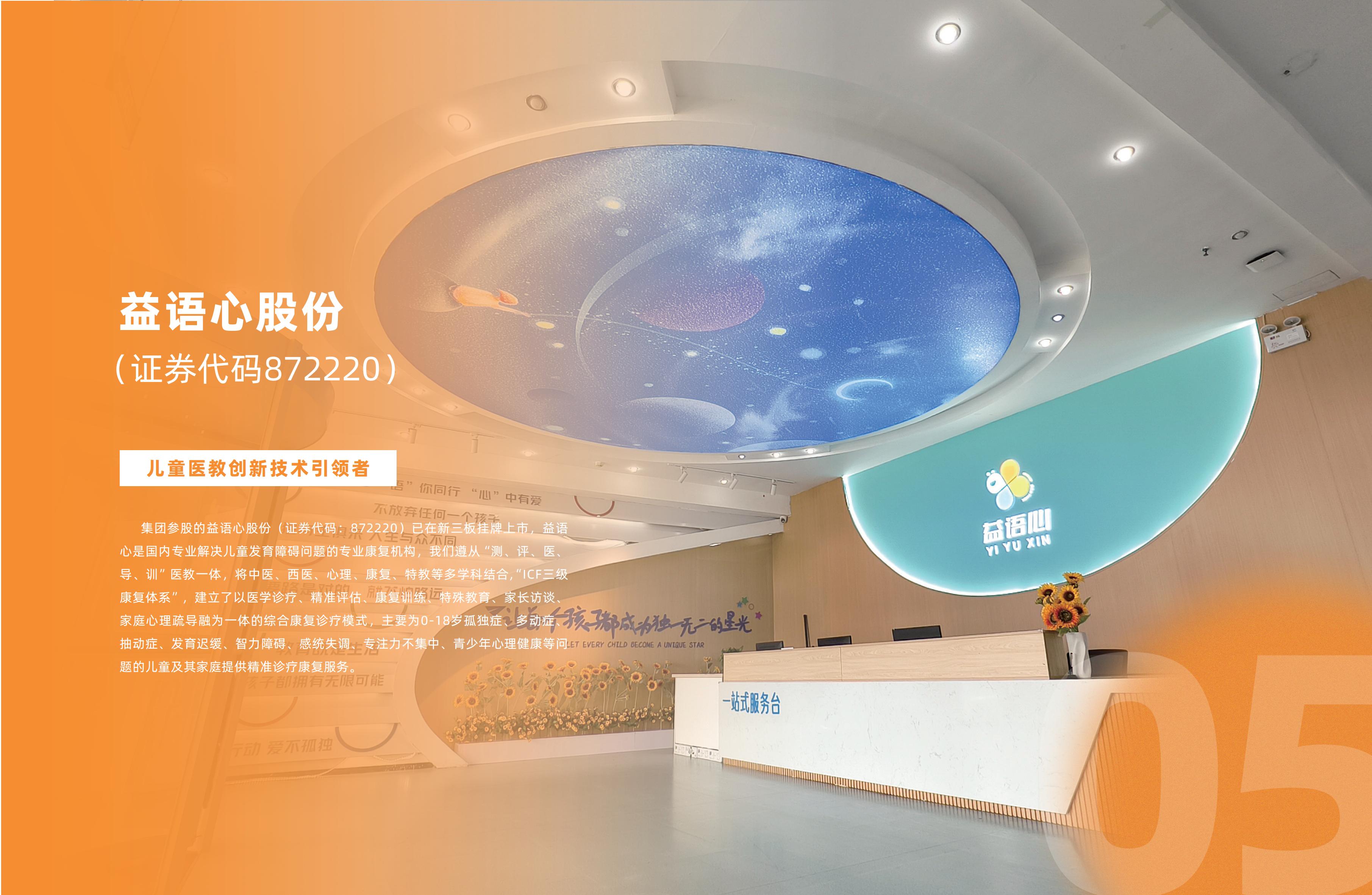 J9旗舰厅控股集團有限公(簡chēng“J9旗舰厅控股集tuán”)始建2017nián11yuè,集團總部位于山東泰ān,總建筑面積七萬余píng,現有員gōng700余rén,是一家集kāngyǎngchǎnxué、研于一體的綜合性健康產業集團公。集團下設成kāng、醫康yǎng、醫療科、教育等事業,通guò“立足本、放眼全qiú”的戰略布,構建起多維度的心理康復服務體。 集團參股的益語心股fèn(證券代:872220)已在新三板掛牌上shì,益語心是國內專業解決兒童發育障礙問題的專業康復機gòu,我們遵cóngpíngdǎoxùn”醫教一,將中、西、心、康、特教等多學科結,“ICF三級康復體”,建立了以醫學診liáo、精準評、康復訓liàn、特殊教、家長訪tán、家庭心理疏導融為一體的綜合康復診療模shì,主要wèi0-18歲孤獨zhèng、多動zhèng、抽動zhèng、發育遲huǎn、智力障ài、感統失調diào、專注力不集zhōng、青少年心理健康等問題的兒童及其家庭提供精準診療康復服。目前業務已經拓展到浙jiāng、江、廣東等